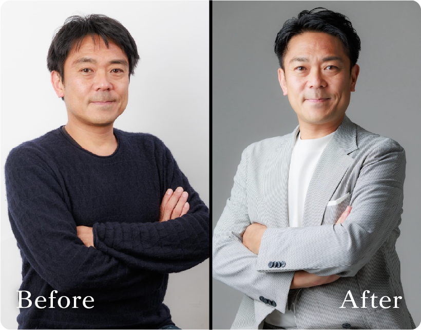 事業サービスの想いを汲み取って頂いただけではなく、届けたいお客様別に想いを表現した写真を使い分けることにも驚きましたが、ファッションで「想いと見せ方」を表現できることに何より驚きました。写真を変更し、ファッションを任せてから取材・講演・メディア出演の依頼が後を絶たないです。3倍どころではないかもしれません!